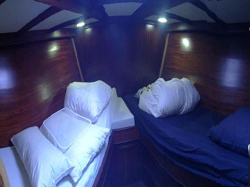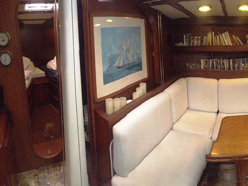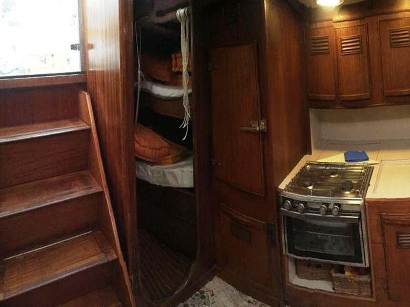 Accessori: cucina con fornelli e forno a gas, tender, tubo imbarco acqua 20 m e secchio, 2 bombole gas da 3 Kg ciascuna, 2 maniglie winch, ancora DELTA da 25 Kg, 60 m di catena diametro 10, ancora di rispetto, mezzo marinaio, vettovagliamento completo per 8 pax, cassetta attrezzi, cassetta ricambi elettrici, cassetta ricambi motore